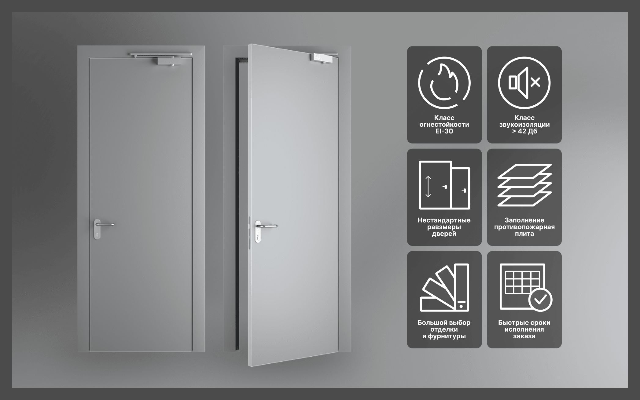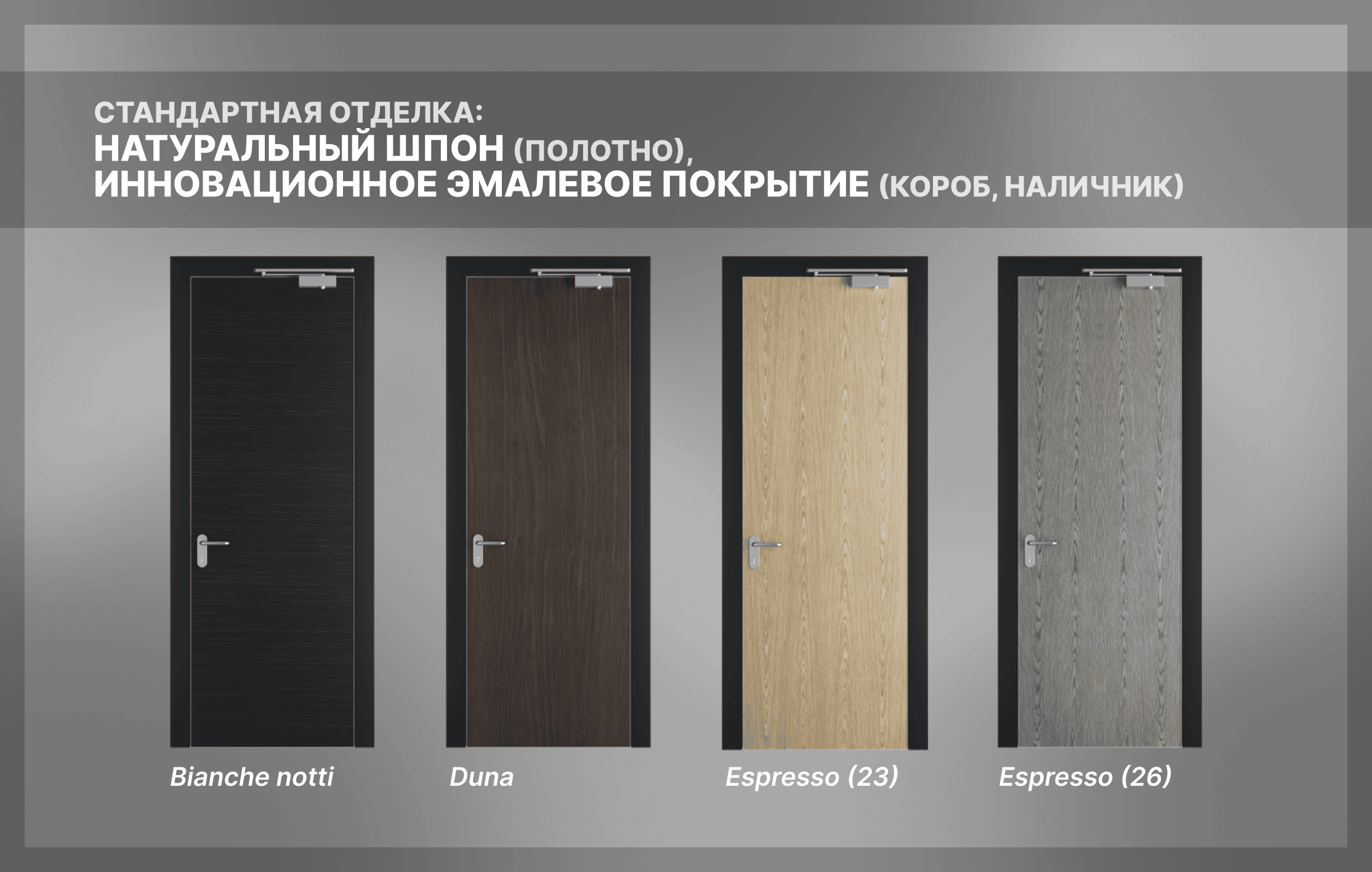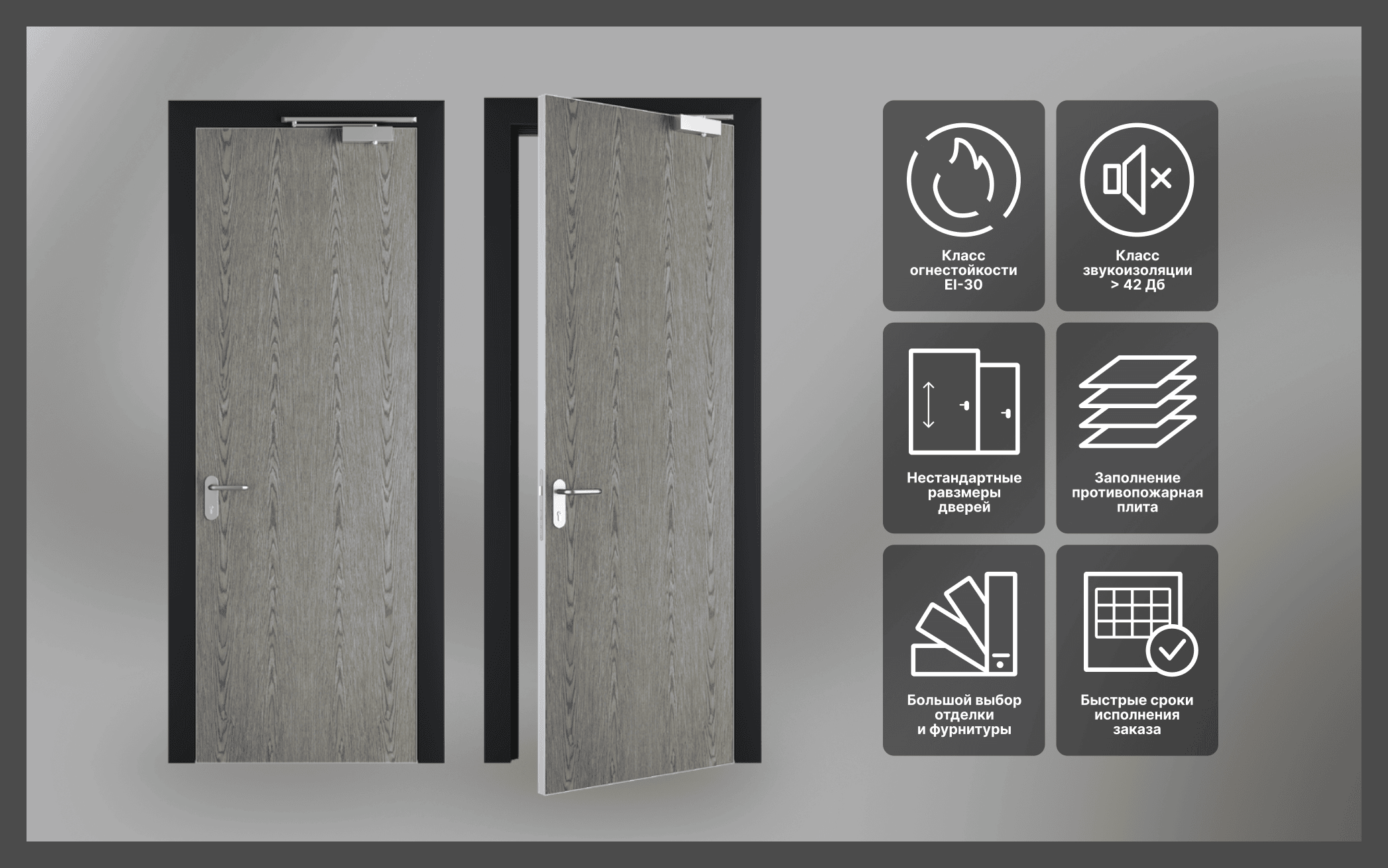 Противопожарная дверь больше не должна выбиваться из вашей дизайнерской концепции. Фабрика Profildoors рассматривает огнестойкие двери как к полноценный интерьерный элемент. Каждый дверной комплект включает всё необходимое: полотно, коробку, уплотнители, торцевую кромку, автопорог, фурнитуру - и всё это мы индивидуально адаптируем под ваш проект с учётом архитектуры помещения, отделочных решений, инженерных требований и, конечно, нормативам пожарной безопасности (класс EI-30).